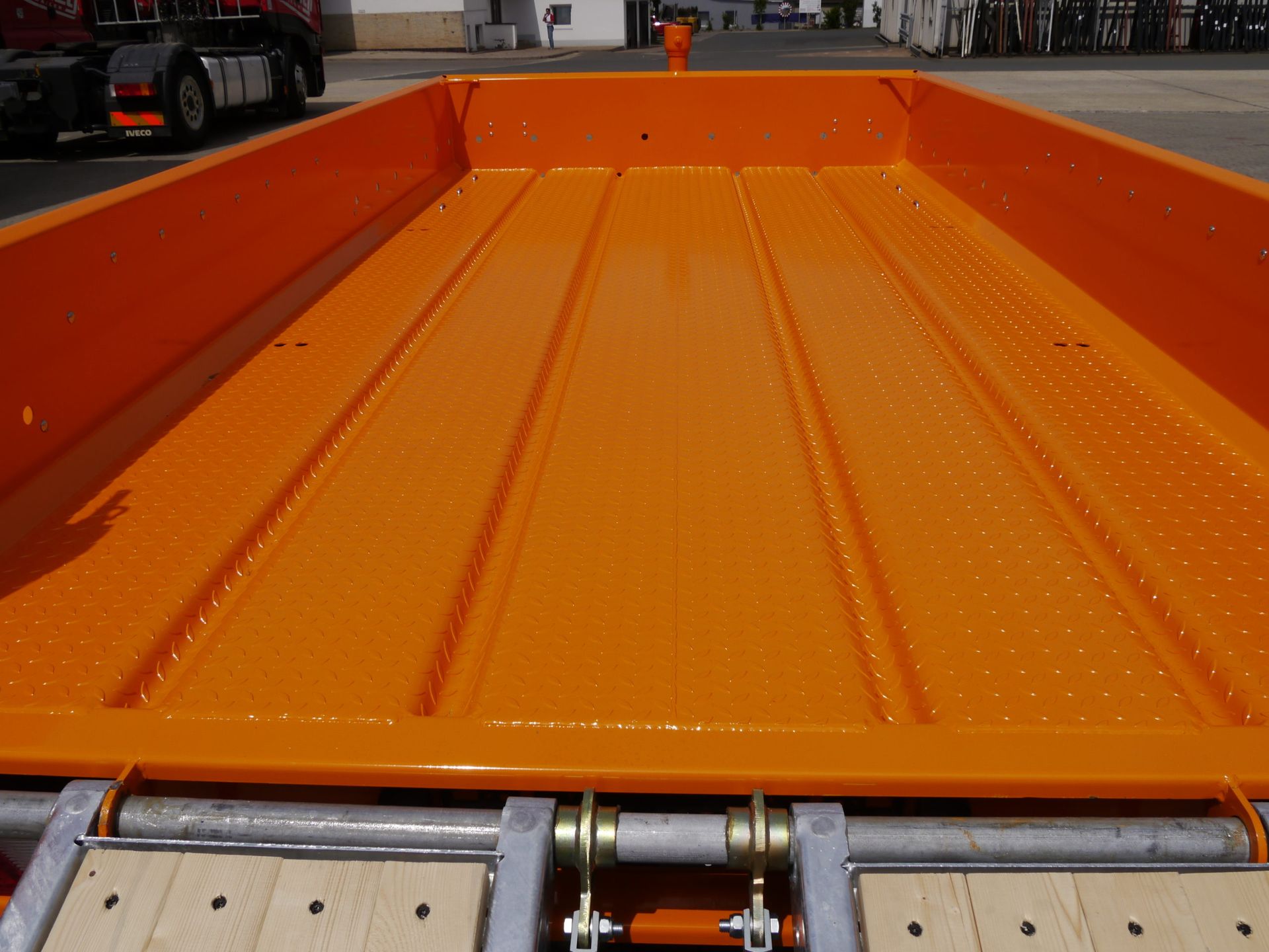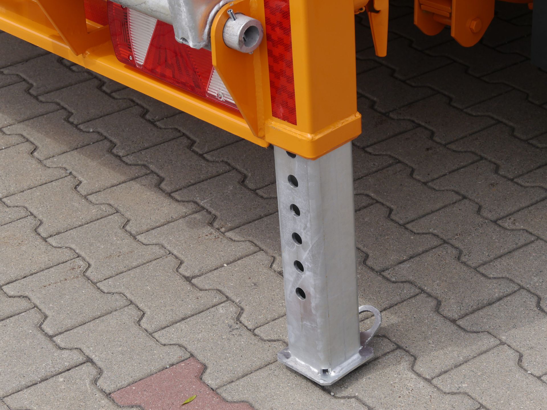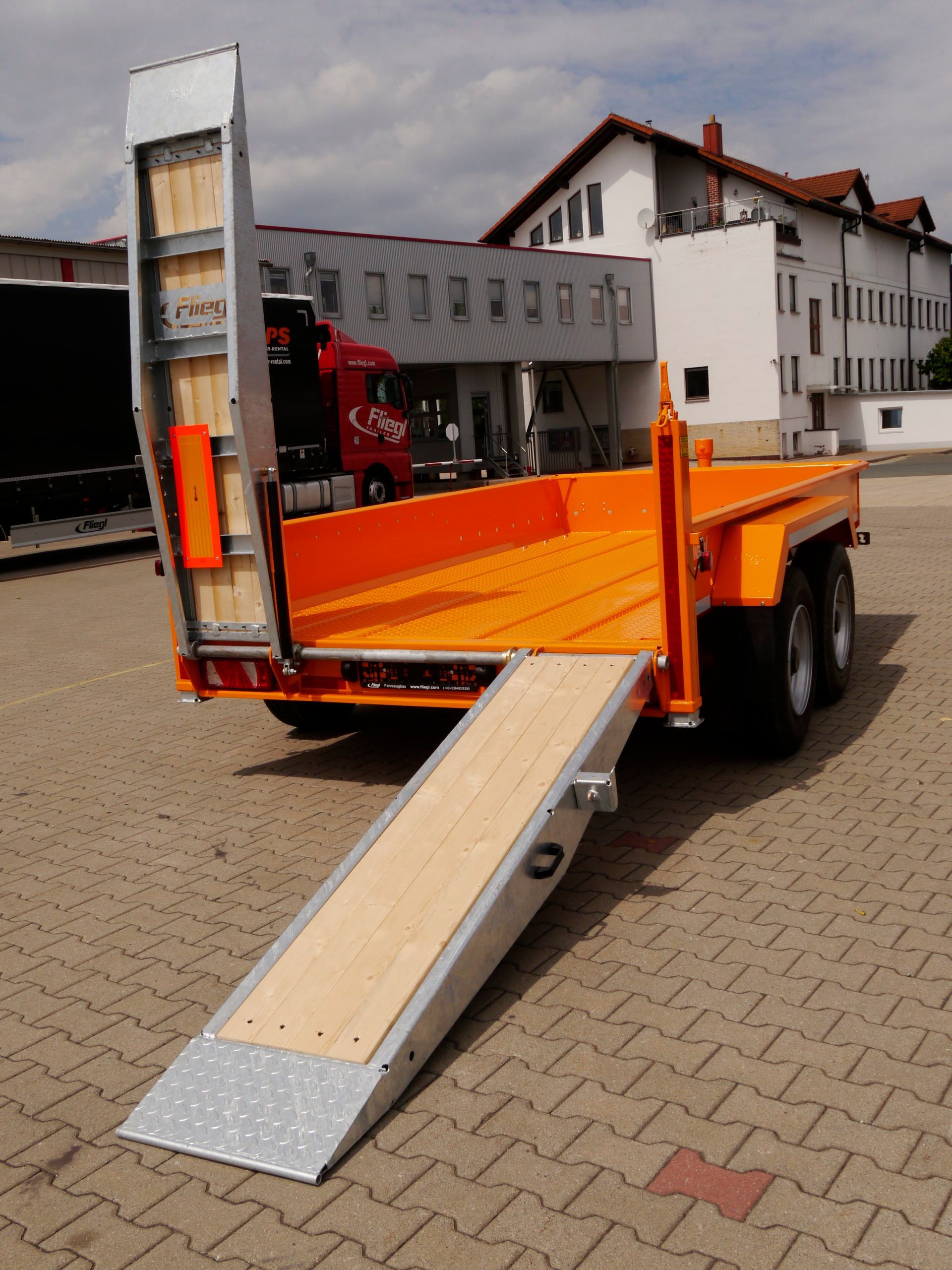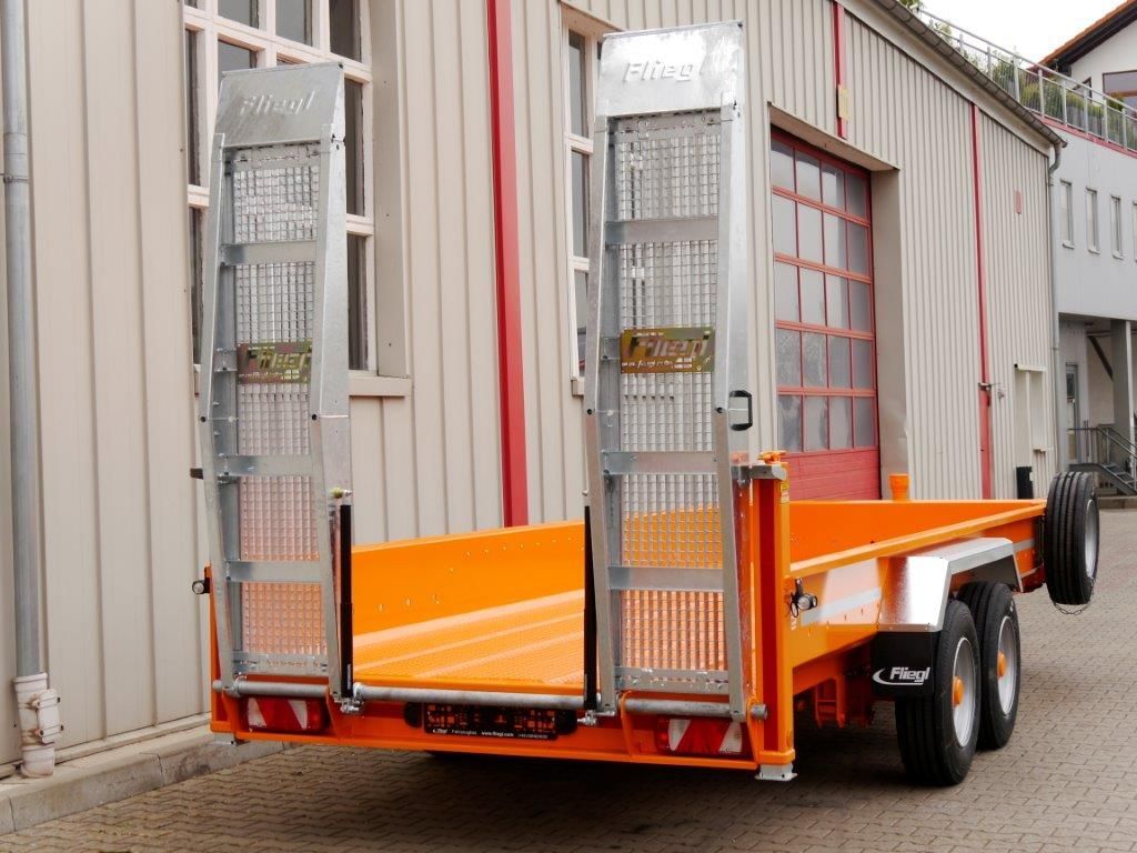 - Барабанные тормоза Длина грузовой поверхности: 4 500 мм (опционально 5 500 мм или 6 500 мм) Ширина грузовой поверхности: 2 050 мм 4 пары точек крепления (2 x 2,5 тонны; 2 x 5 тонн) Шины 235/75 R17,5 Цвет прицепа: Оранжевый RAL 2011 400 мм Высокие окрашенные боковые стенки Буксировочная проушина ø 40 мм Стальная плита пола толщиной 4 мм Механическая подвеска на пружинах, регулируемая высота сцепки от 600 до 850 мм Стальные подъездные пути для транспортировки строительной техники