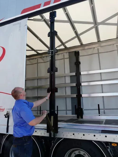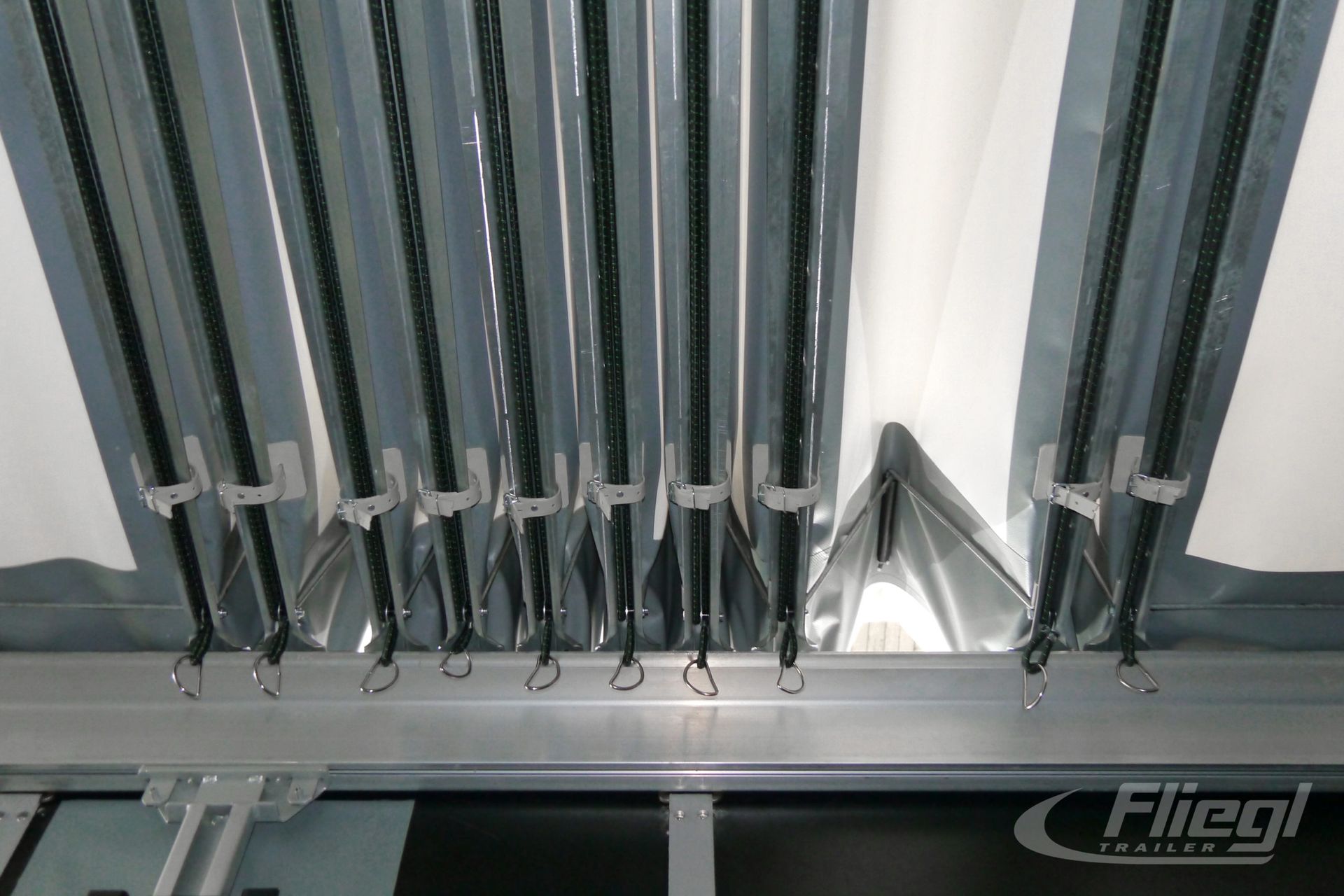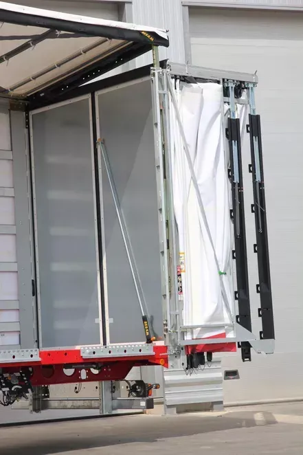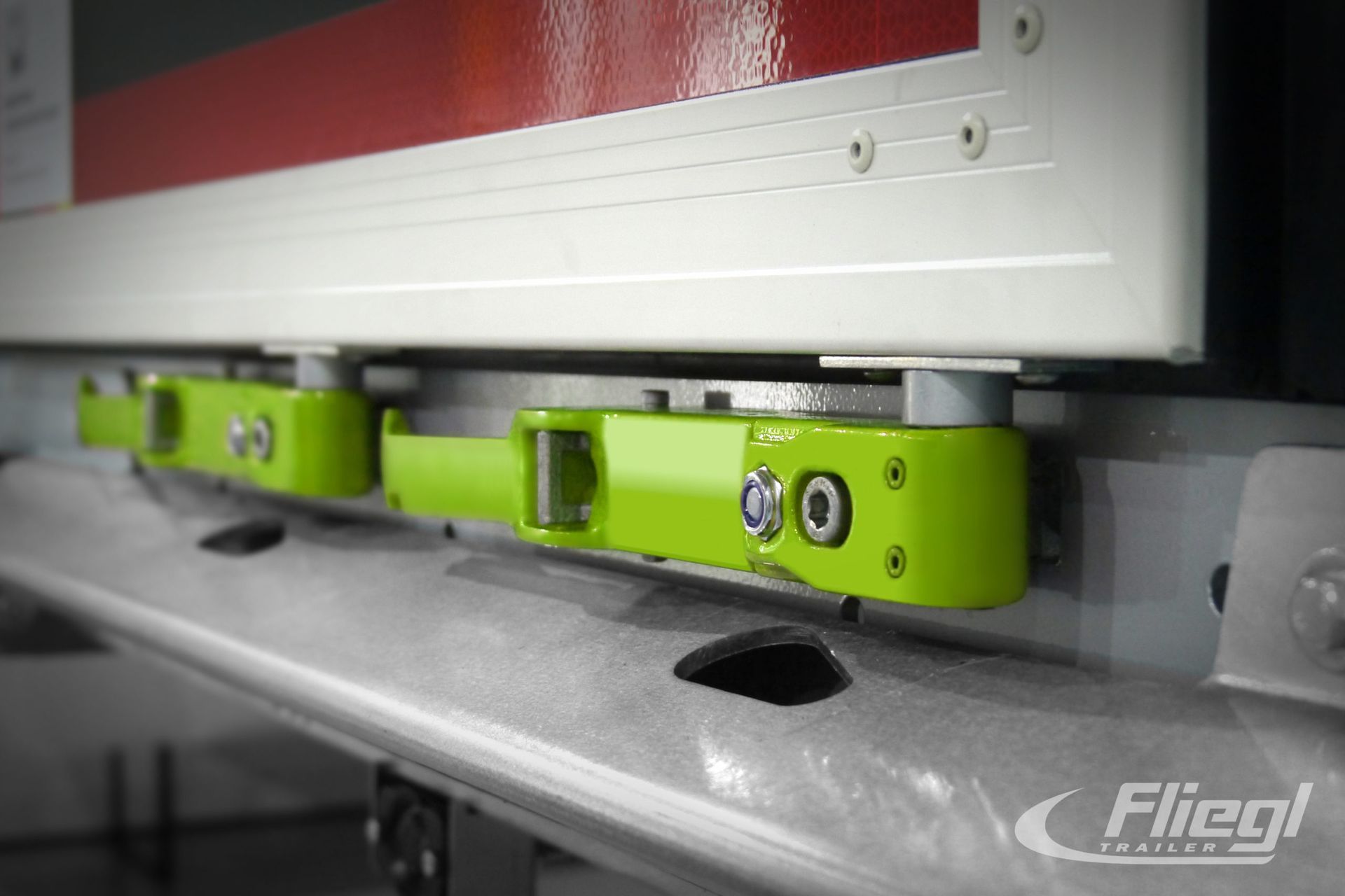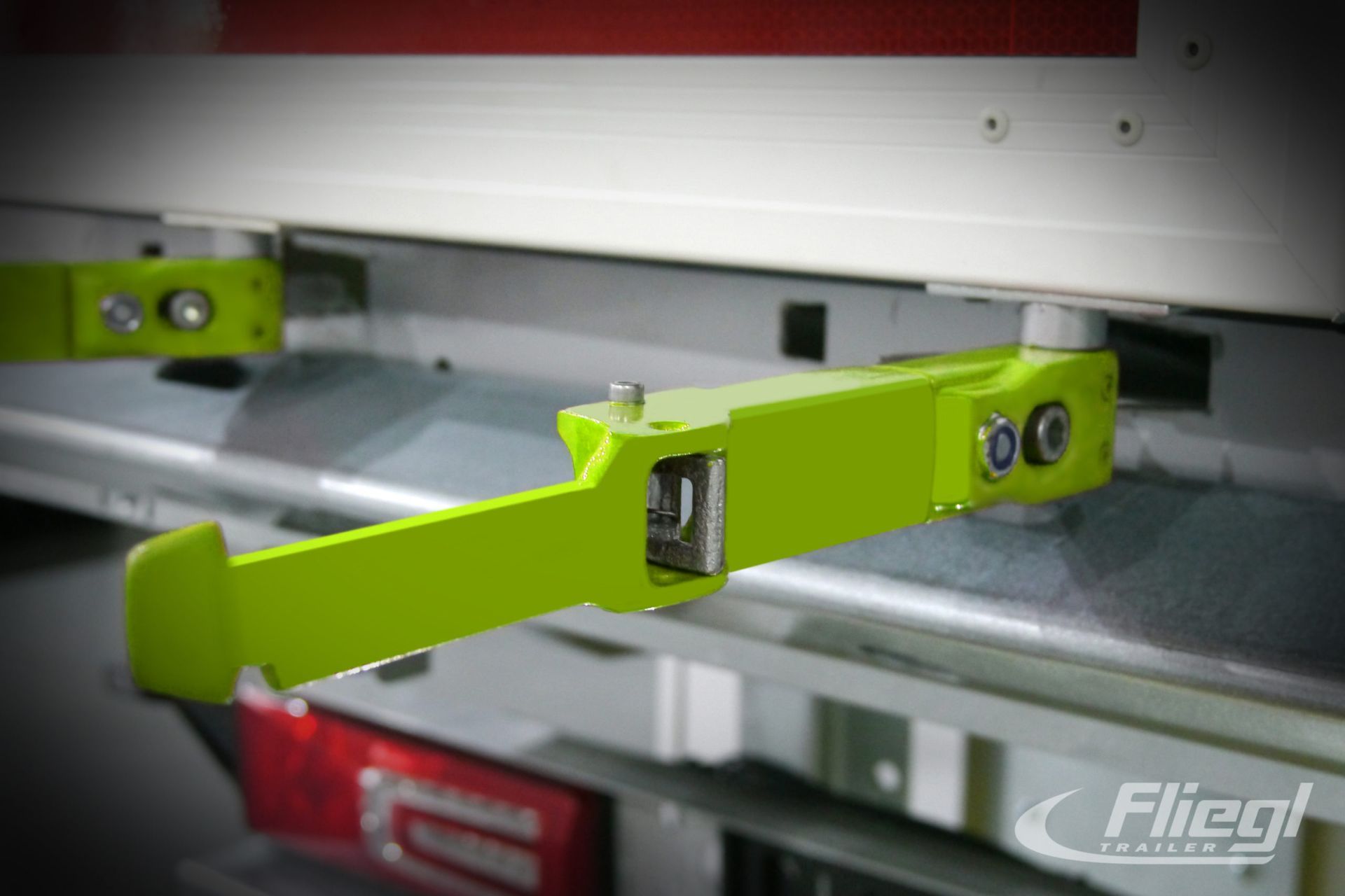 Система Free Load позволяет получить 13,2 м свободного бокового грузового пространства в шторе. Флигль использовал специальный портал, на котором крепится не только тент, но и стойки. Он установлен на задней стойке полуприцепа. Чтобы получить полное боковое грузовое пространство, нужно выполнить несколько простых и легких шагов.